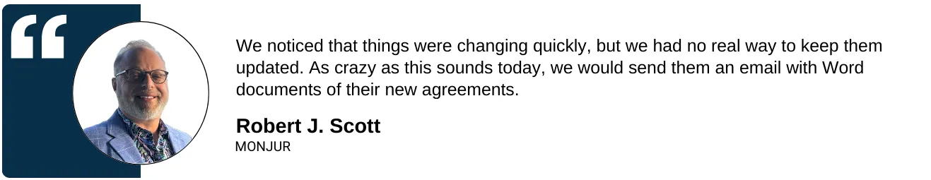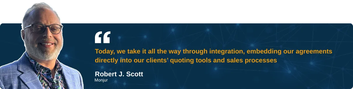 • Works with Quoter, ConnectWise, HubSpot, and more, so the system fits into the workflow your team already uses. Monjur’s attorney-supervised Contract Intelligence layer gives your legal team full control over the source documents, while sales works from approved, controlled links. No one needs to chase down the right version or touch the underlying documents.